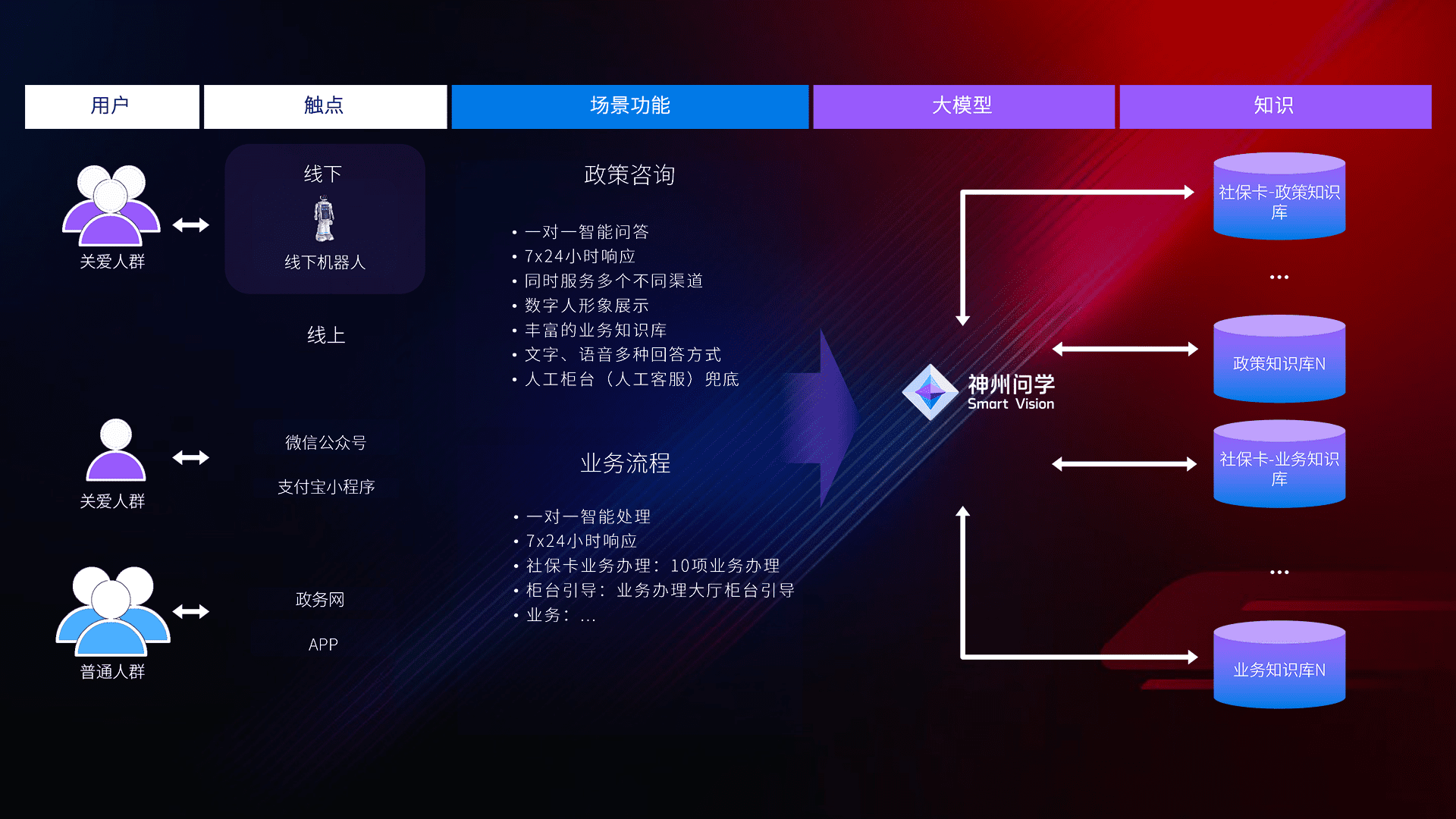 • 线上线下全覆盖:线上提供微信公众号、、、支付宝小程序、、、、政务网、、、、app多种渠道,,,与线下机器人形成完整服务体系。。。